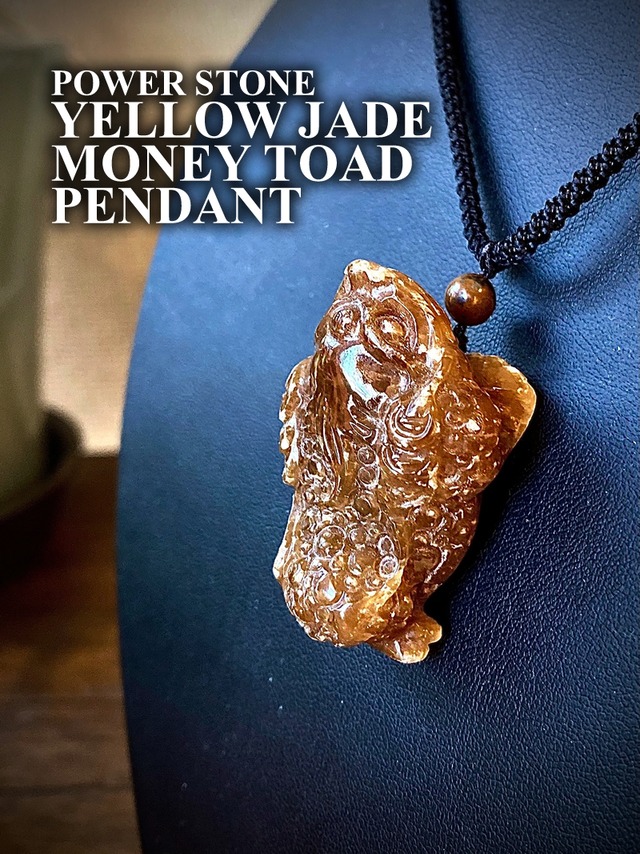 セレクトインポートしました天然石イエロー香翡翠Money Toad (ガマガエル) ペンダントです。 カービングのエッジが白目立ちするのがこのイエロー翡翠の特徴。 とてもあめ色ブラウンで落ち着いた照り感。 到着時はかなり強い香りがしていましたが、今はほぼ香りは感じないと思います。 かっこいい子です。 中国の古文書「神仙伝」に登場するこのガマガエルは主食が小銭という妖怪。 ですが、話の中で「劉海蟾」という人物にこらしめられ、口からお金を出して貧しい人々を助ける瑞獣(吉祥をもたらす獣)となったそう。 1点ものになります。 Size:H 4.5 x W 3.4 x D 2.7 cm ブラックダブルスライドロープで長さ調整できます。 ヤマトにてお届けです。 ※ネコポス可能ですが、簡易包装になります。(厚さ3cmまで) クラックの場合保証できかねませんことご理解のうえ 発送方法ご選択ください。