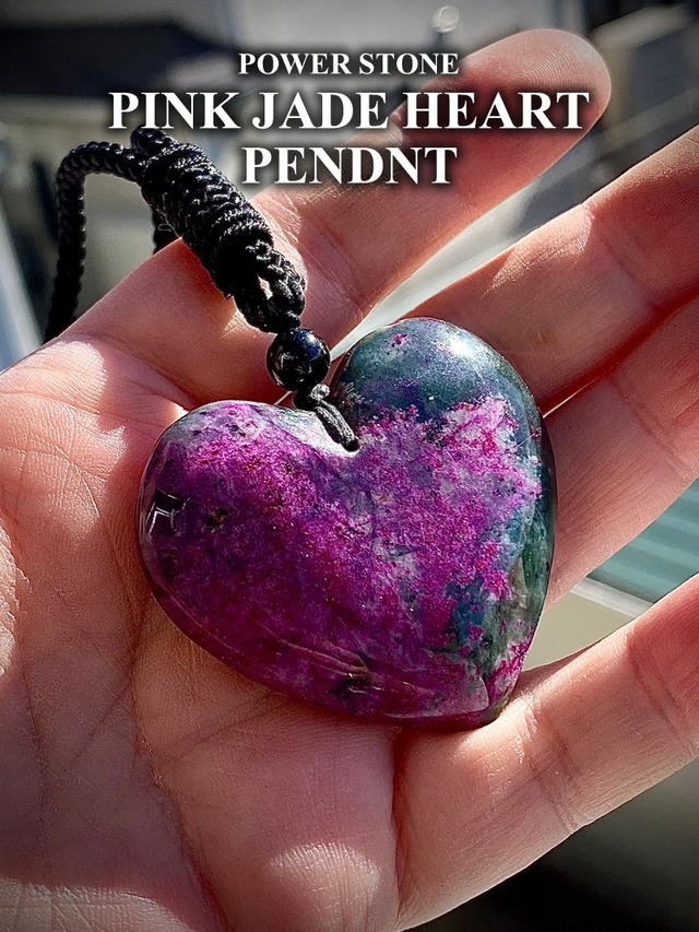 海外からセレクトインポートしました。 翡翠のハートペンダントです。まるでルビーみたいに細かめに強めなピンクが パンチをきかせるベースグリーン多目なペンダント。 グレイッシュスモーキーグリーンです。 コントラストを楽しみたい方は是非。 チェーンご希望の方は、ご自身で挟み込みのバチカンが販売されているので ロープをカットして挟み込み下さい。 効能: 冷静さや忍耐力を養う効果があるともいわれています。 大切な打ち合わせや交渉の際に、身につけるとよいでしょう。 また、魂の成長や、理想的な人格を思い描いて身につけると、持ち主の最良の性質を伸ばしてくれるといわれています。 Size:H 4.1 x W 4.5 x D 1.4 cm ブラックシングルロープみぞおち下あたりに来ます。 ヤマトにてお届けです。