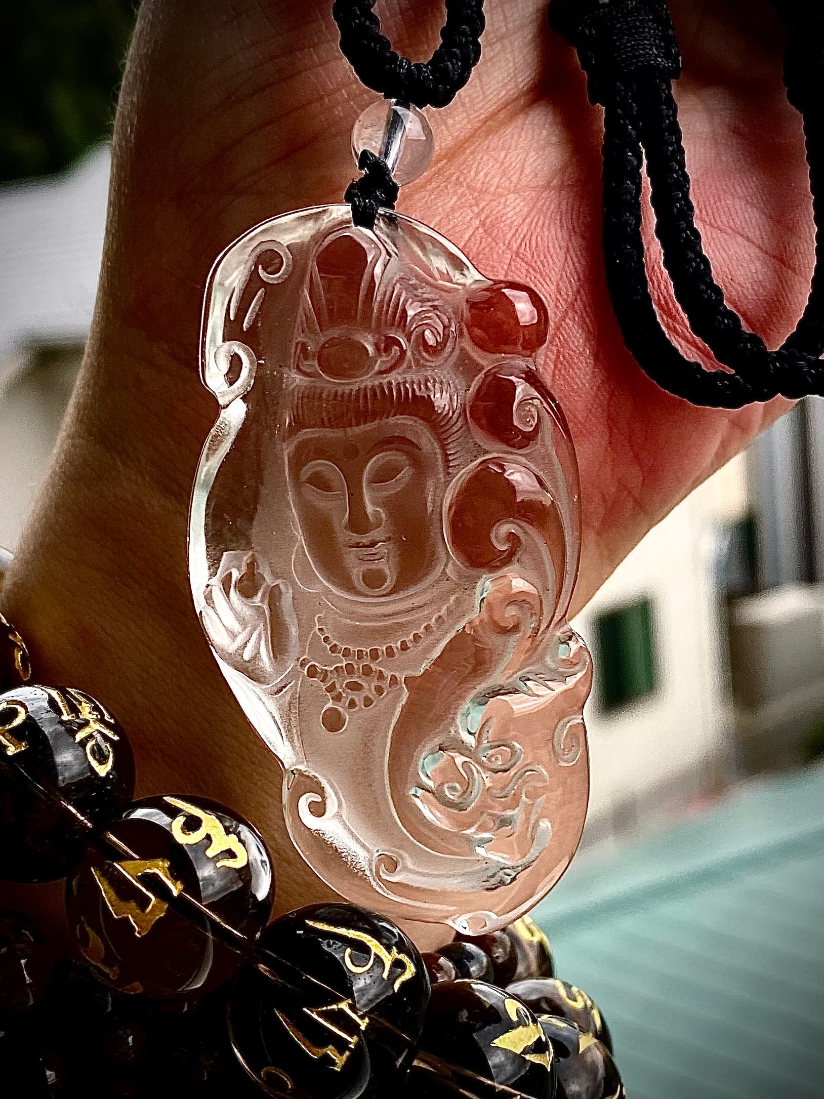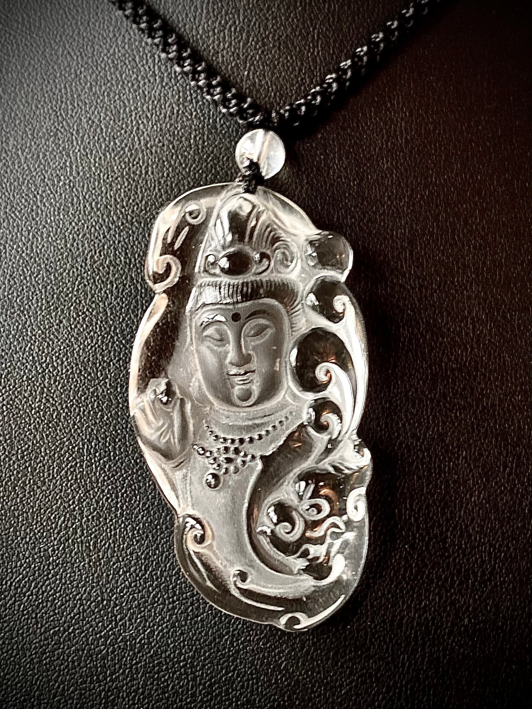 セレクトインポートしました天然石水晶菩薩カービングペンダントです。