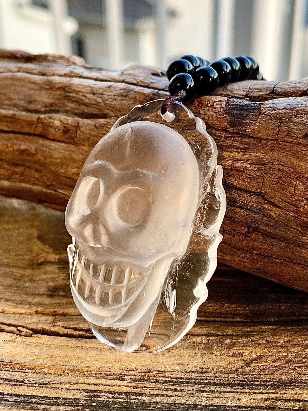 天然石水晶カービングのファイヤーパターンスカルペンダントです。