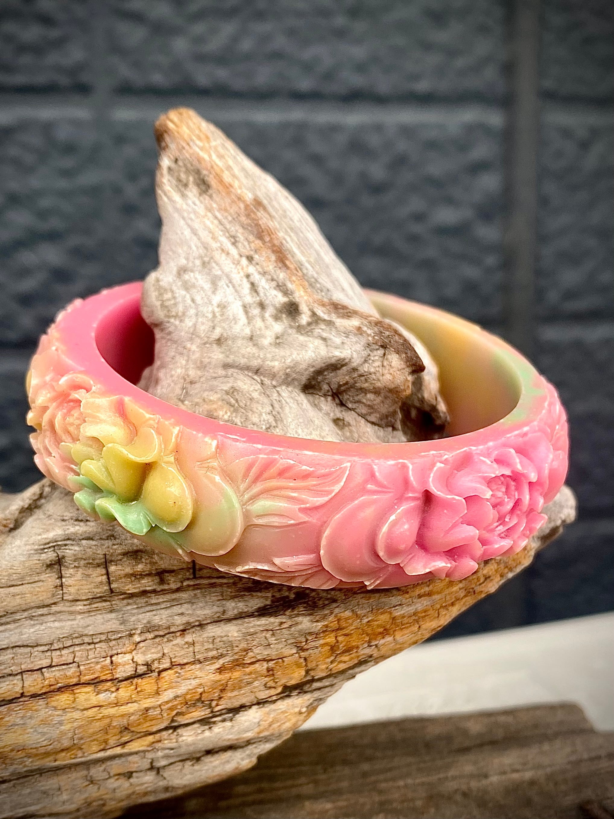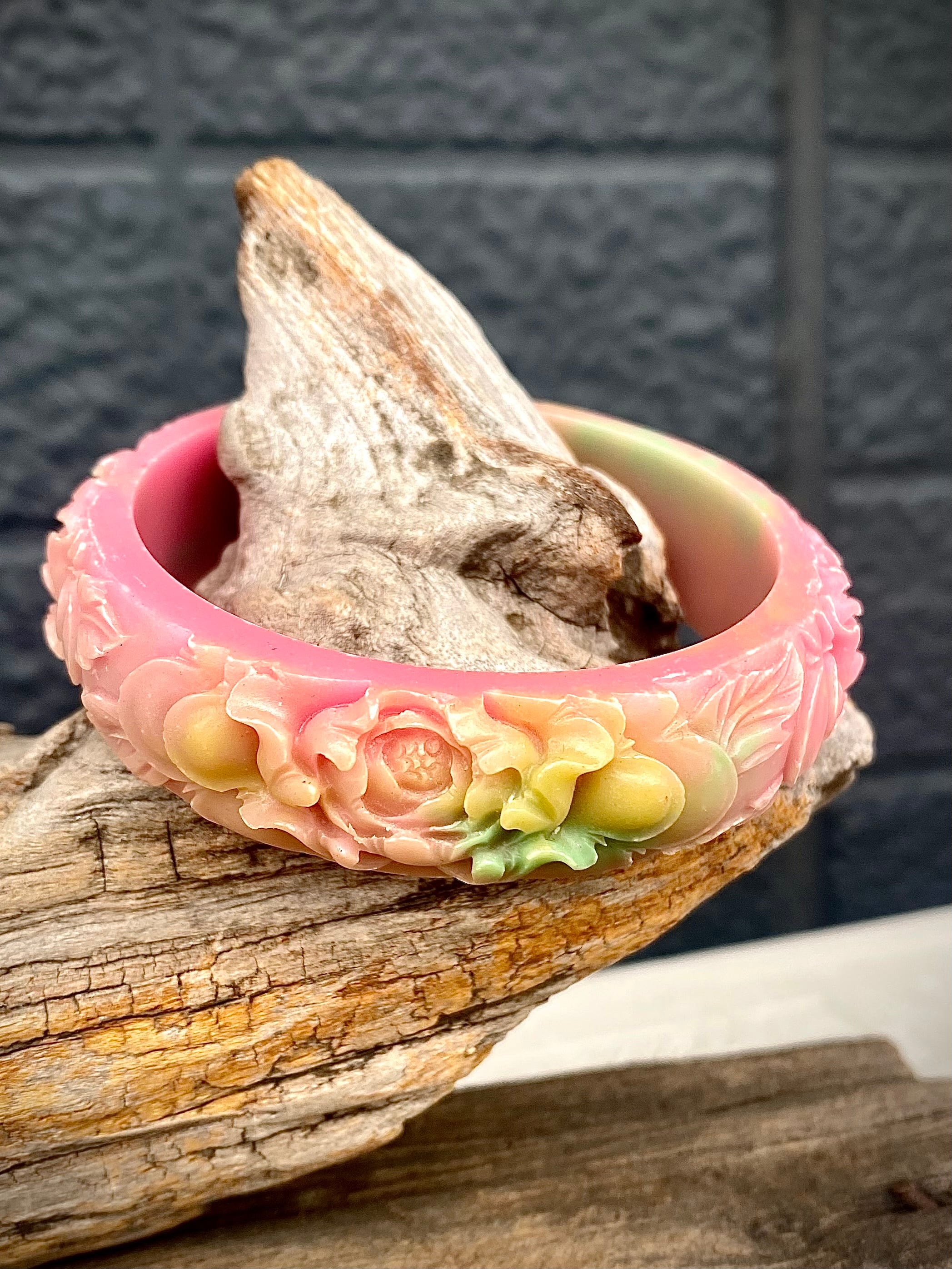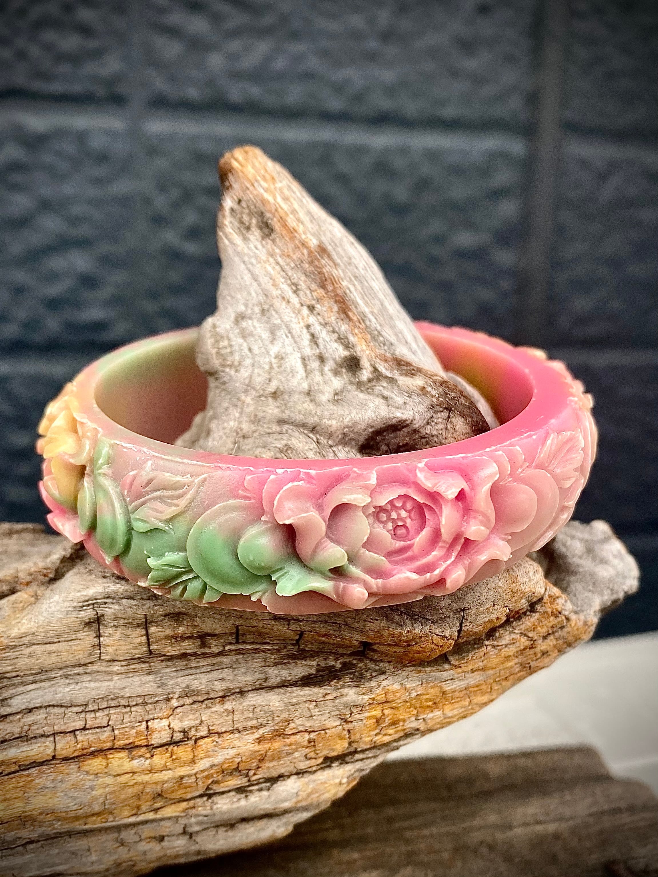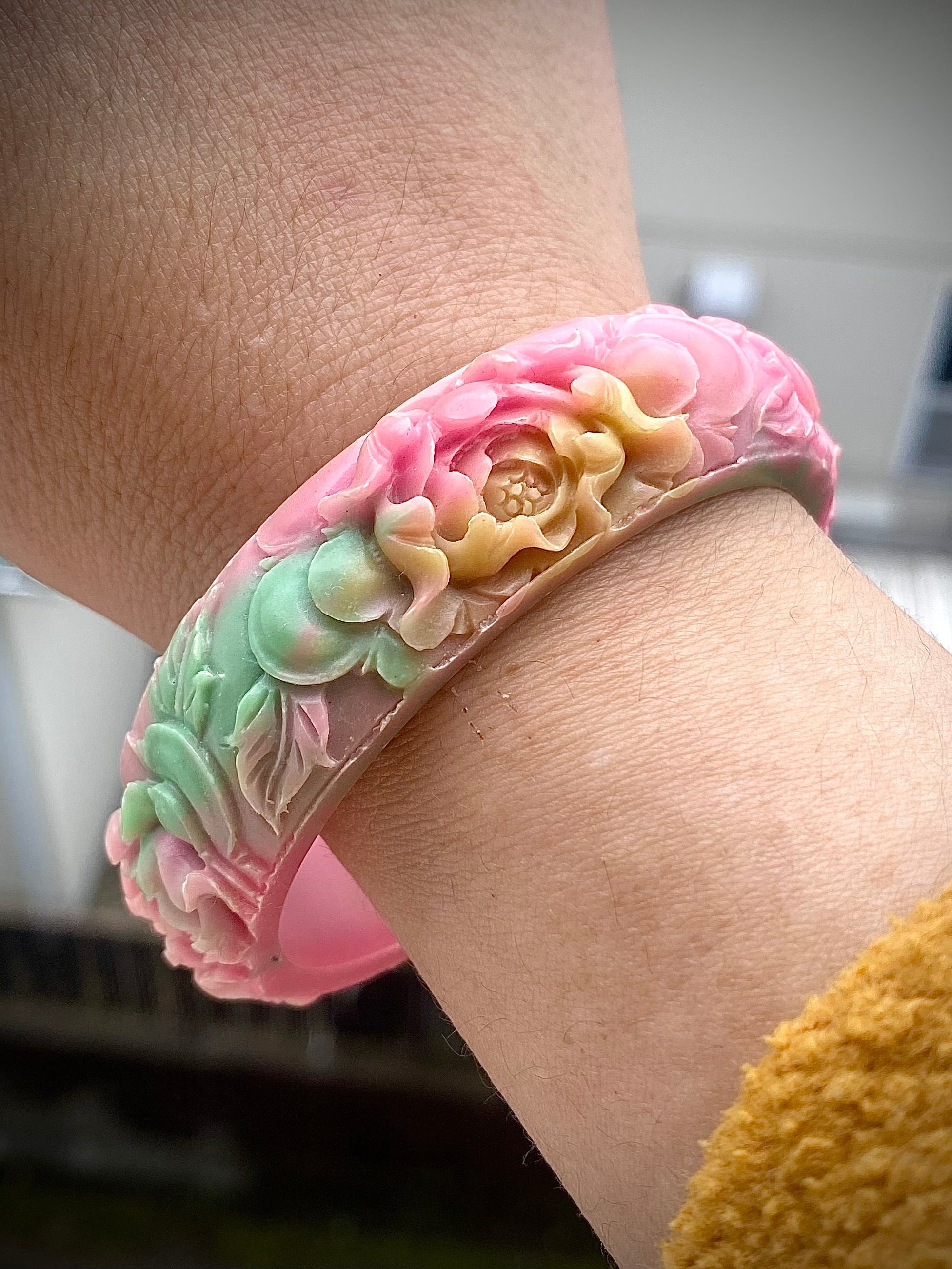 セレクトインポートしました天然石塩源瑪瑙ロータスバングルです。