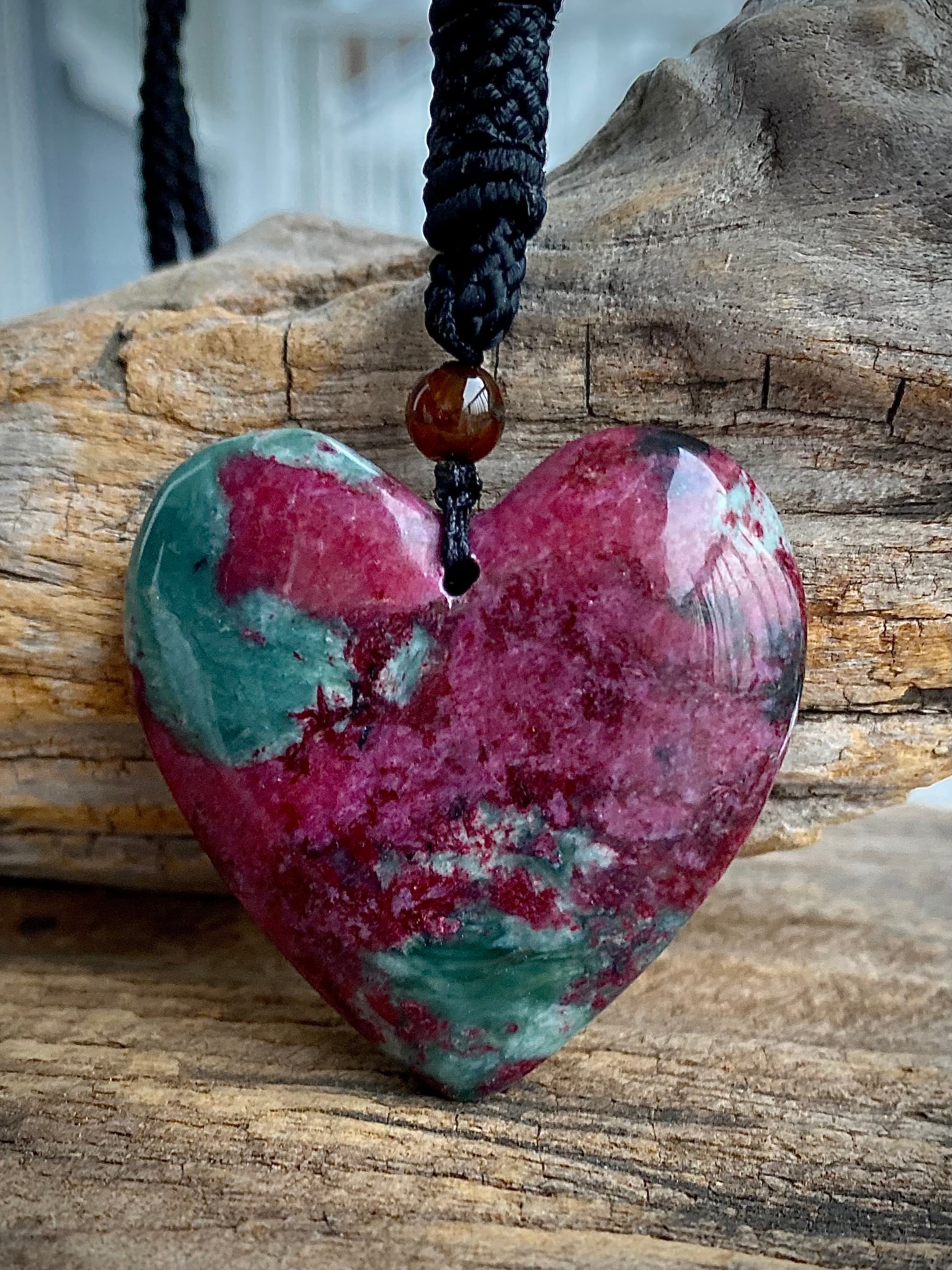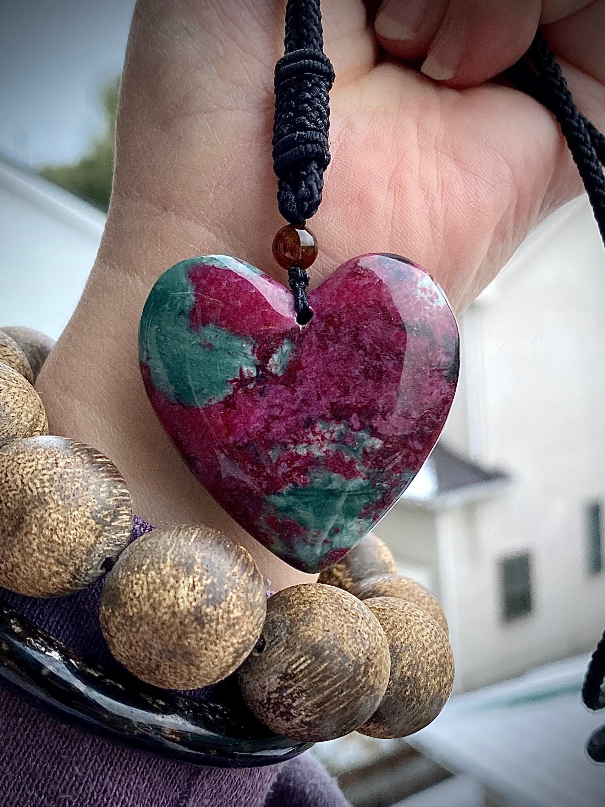 翡翠のハートペンダントです。赤みの強いワインレッドピンクカラーに